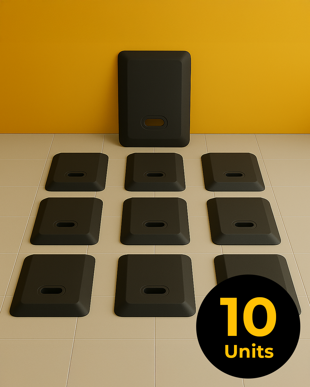 Una cómoda alfombrilla de espuma acolchada diseñada para aliviar el dolor en pies, tobillos, rodillas y caderas mientras está de pie.
