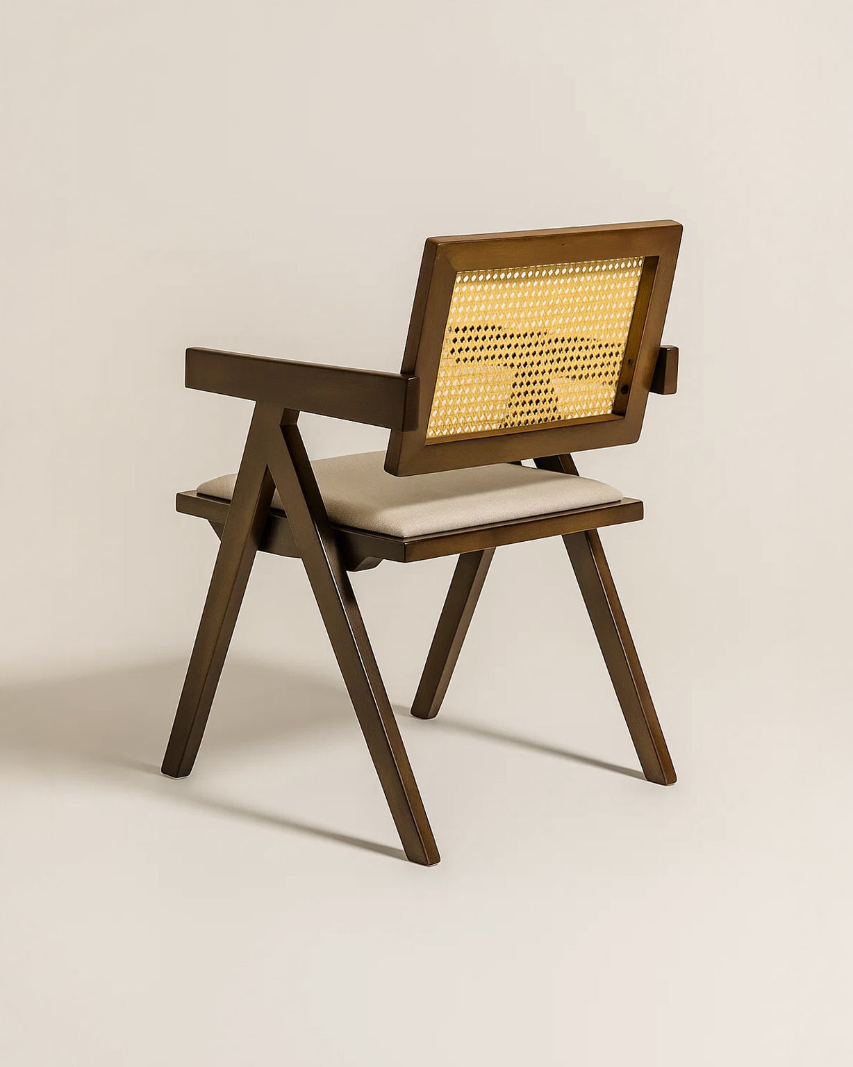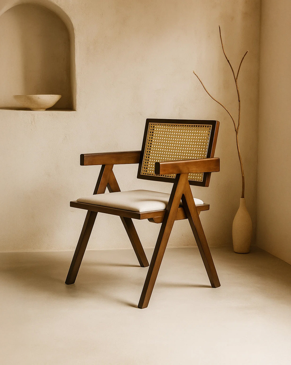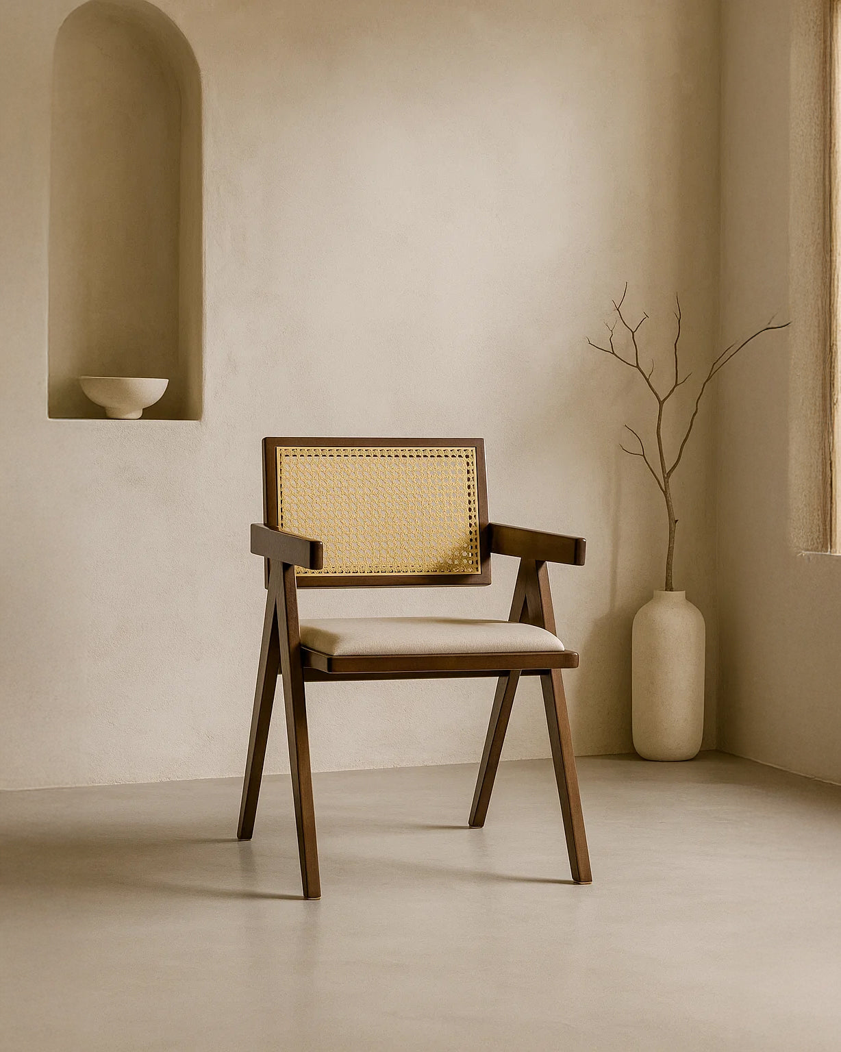 Chiva Rattan & Wood Dining Chair (Chestnut) – Rustic Boho Upholstered Chair with Armrests - Marcel Olsen