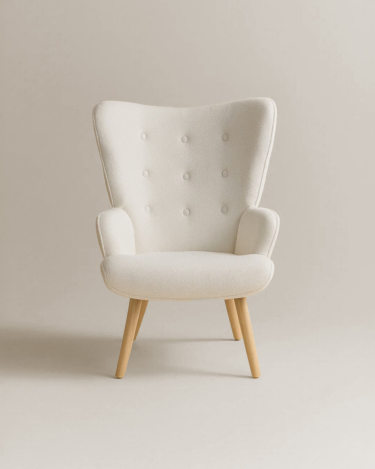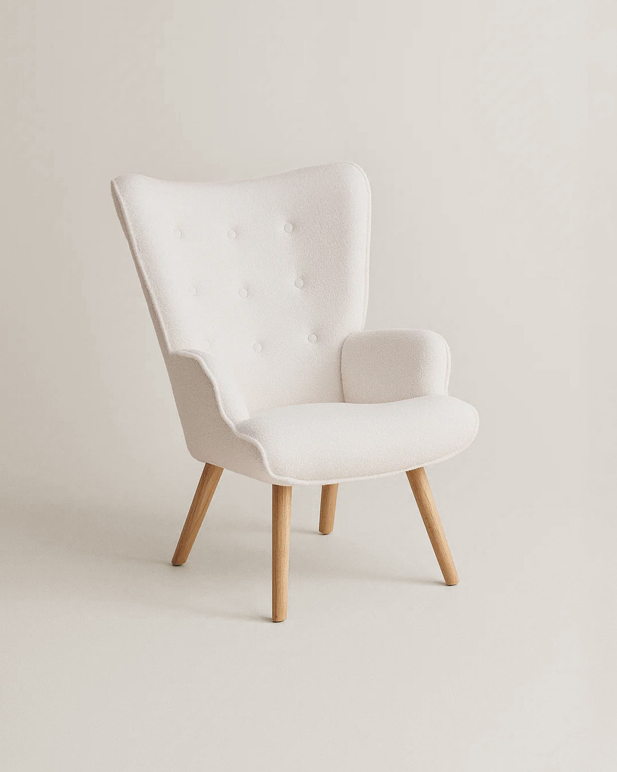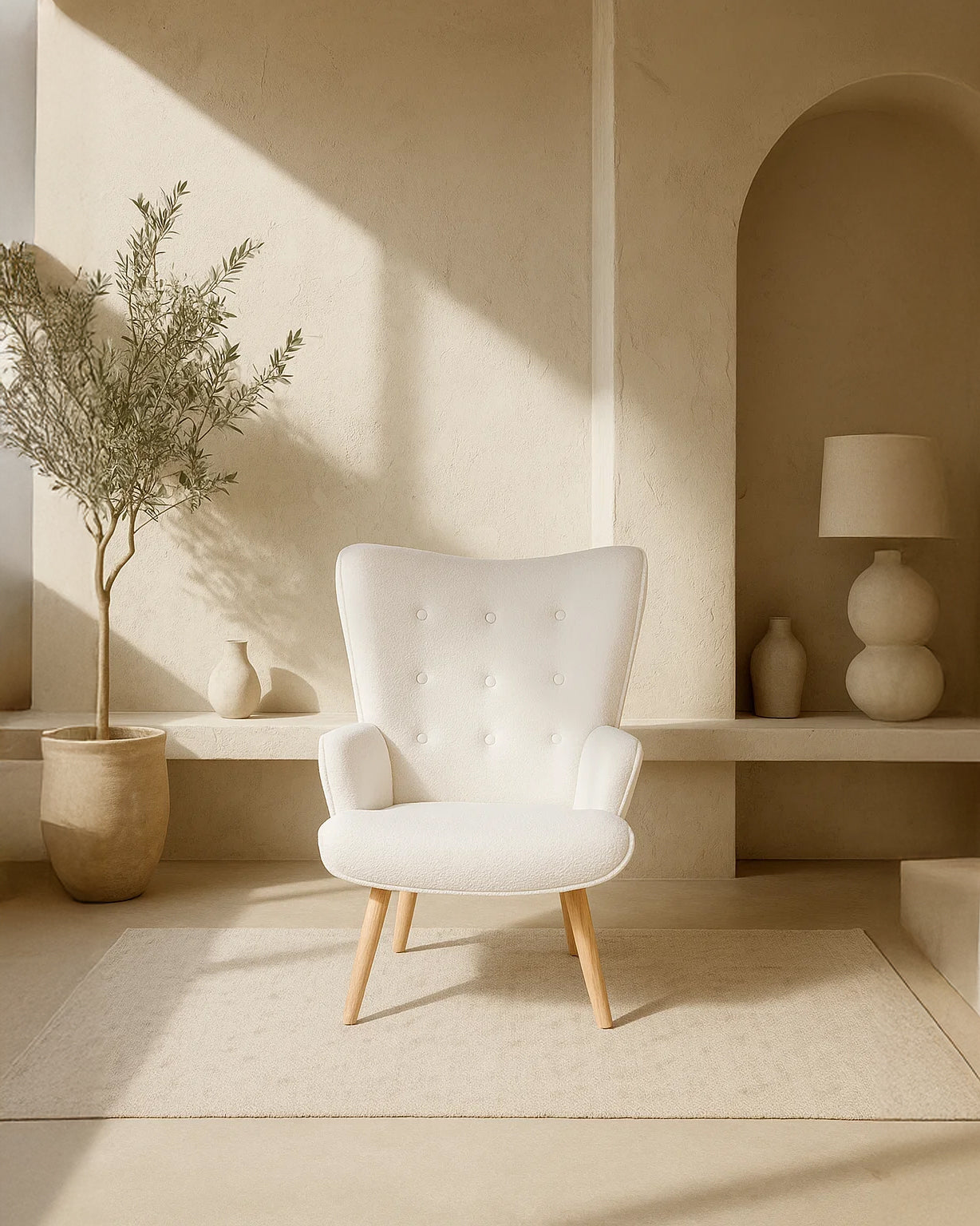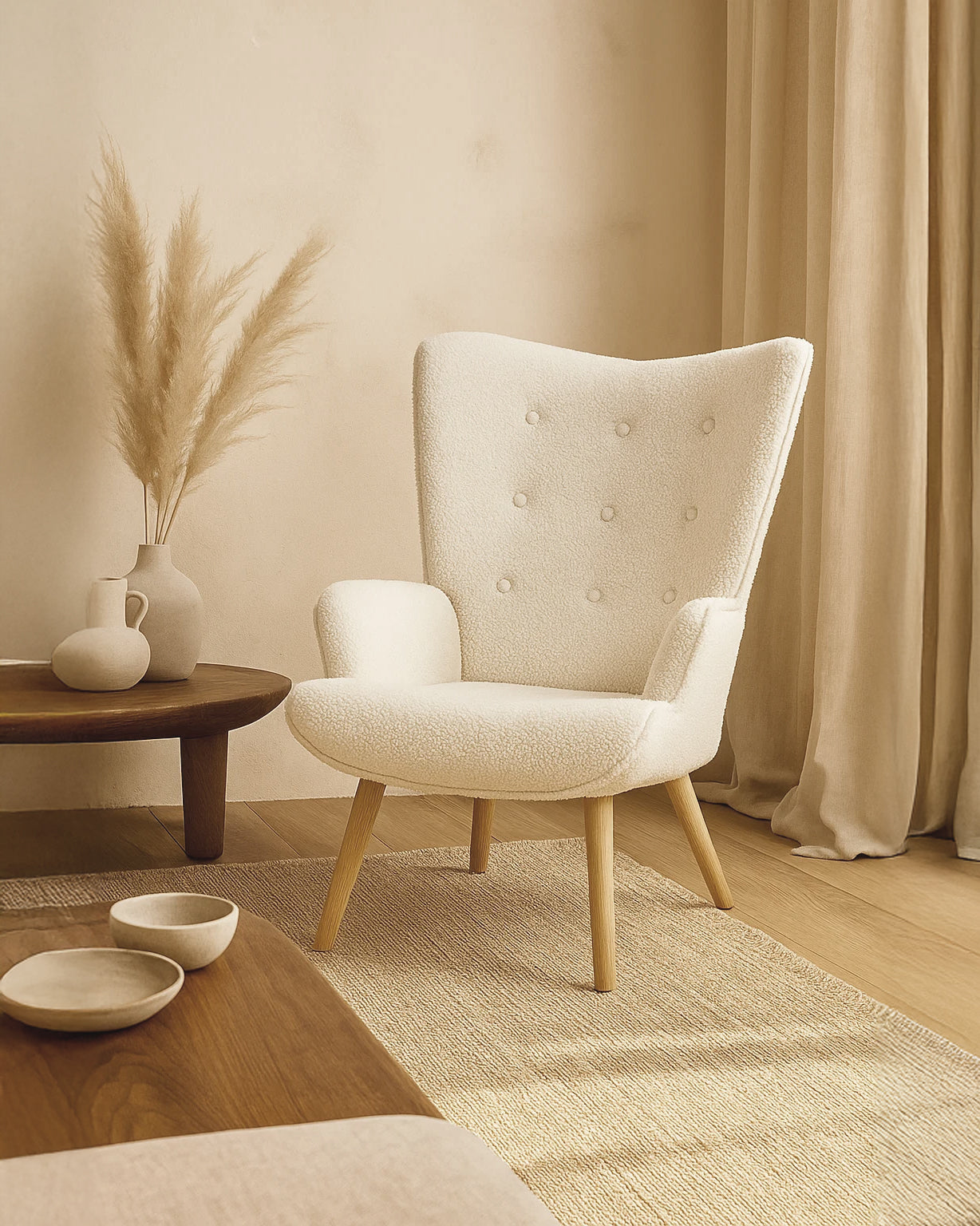 Laissez-vous aller, déconnectez-vous. Le Fauteuil Esplá vous enveloppe dans un confort digne des nuages avec un dossier haut sculpté, des accoudoirs courbés et six boutons discrets qui disent « Je suis chic mais décontracté. » Revêtu d'un tissu bouclé doux au toucher et posé sur des pieds en bois naturel inclinés, il offre ce mélange parfait de courbes enveloppantes et de posture moderniste.