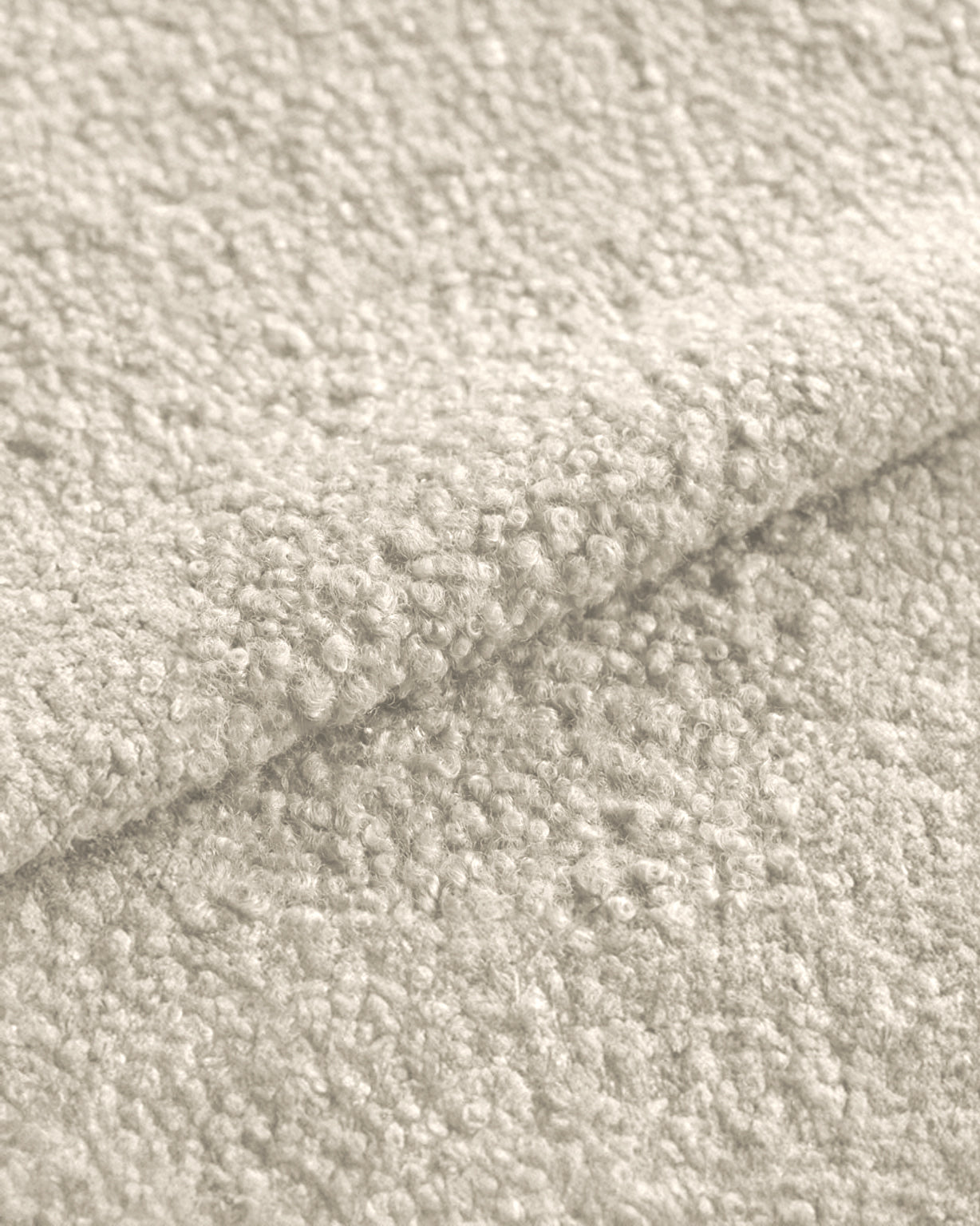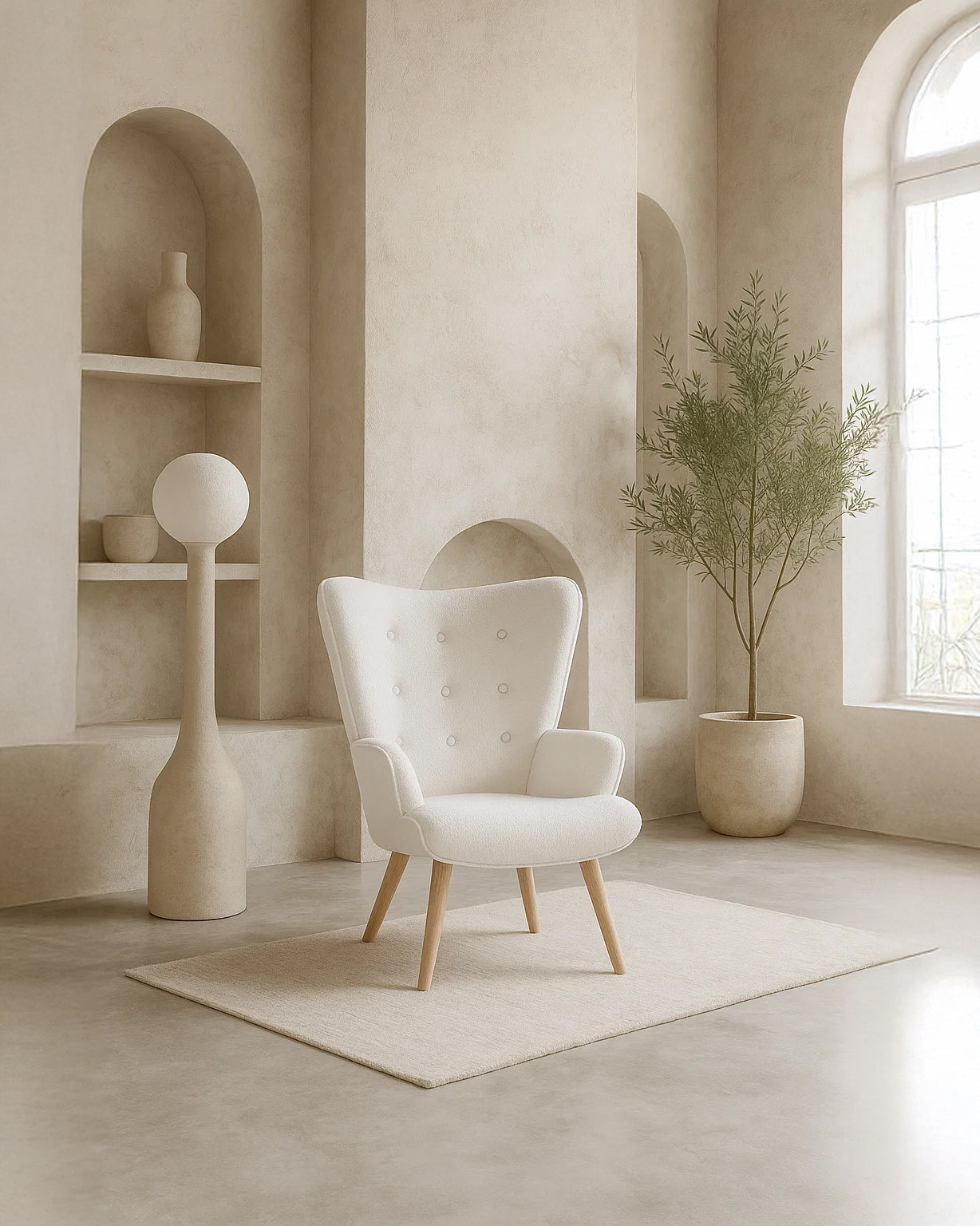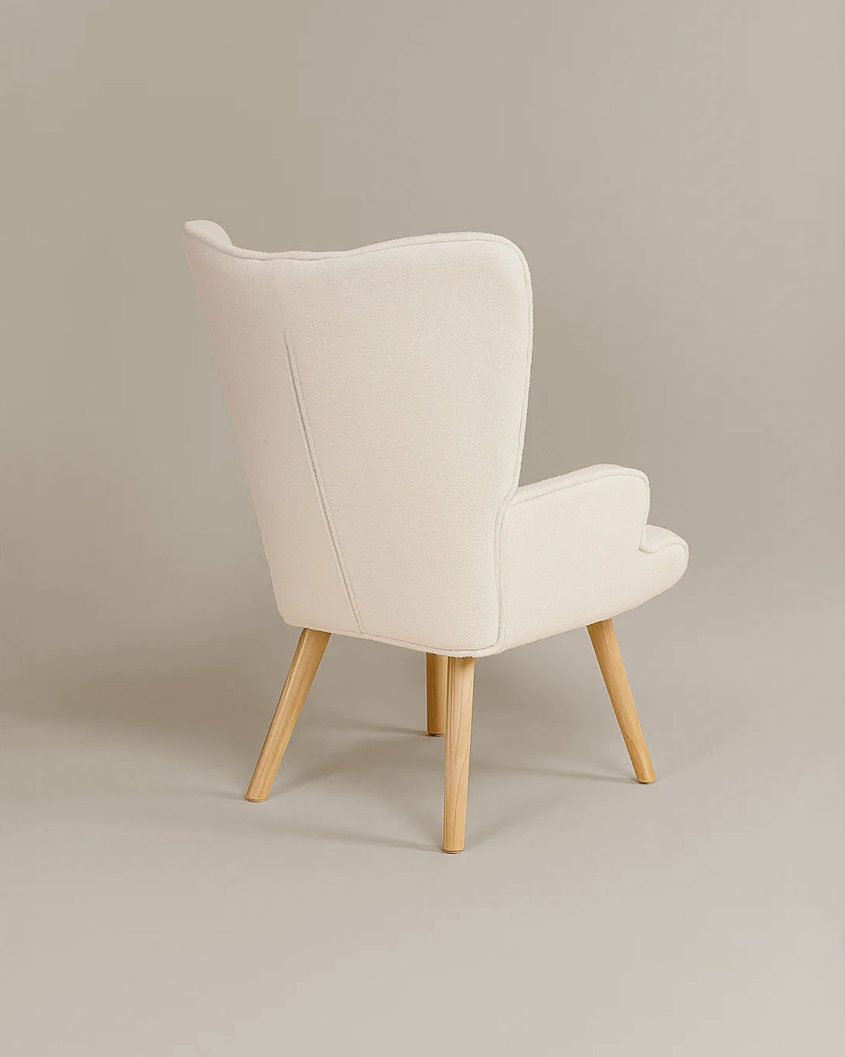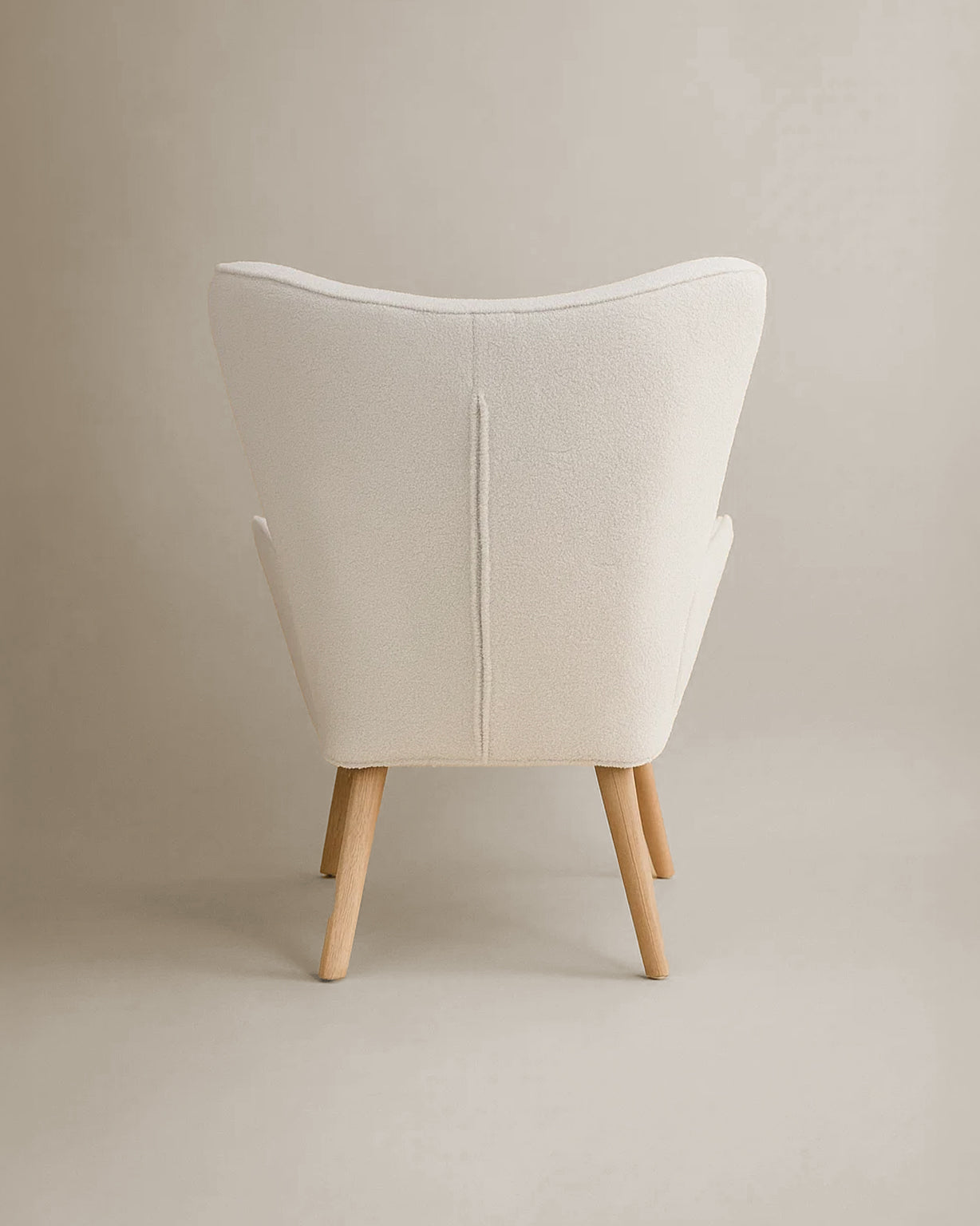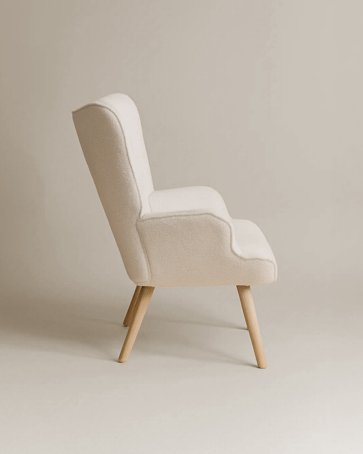 Laissez-vous aller, déconnectez-vous. Le Fauteuil Esplá vous enveloppe dans un confort digne des nuages avec un dossier haut sculpté, des accoudoirs courbés et six boutons discrets qui disent « Je suis chic mais décontracté. » Revêtu d'un tissu bouclé doux au toucher et posé sur des pieds en bois naturel inclinés, il offre ce mélange parfait de courbes enveloppantes et de posture moderniste.