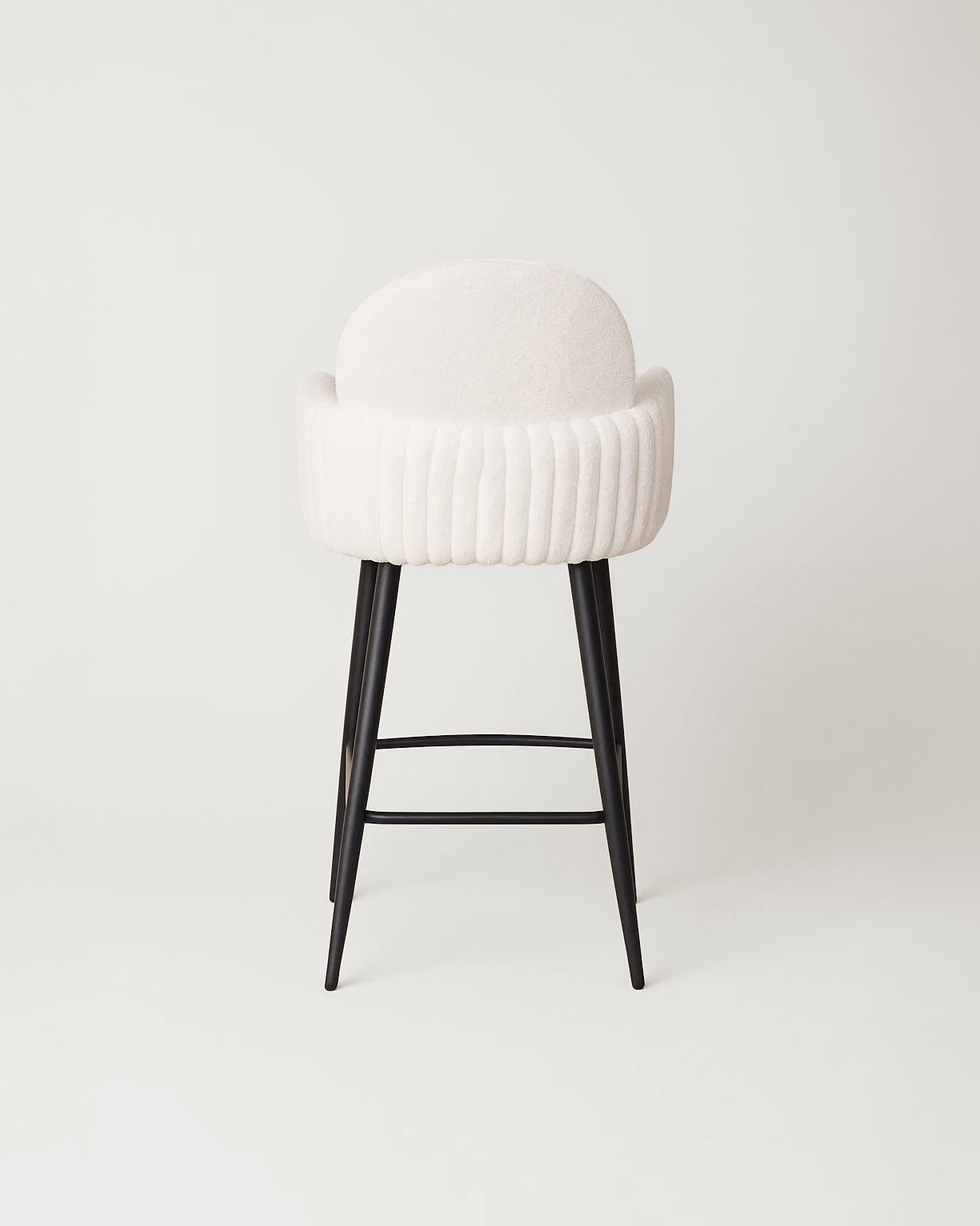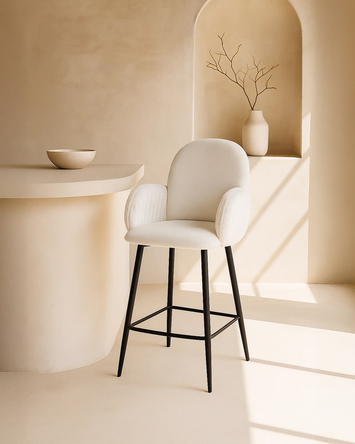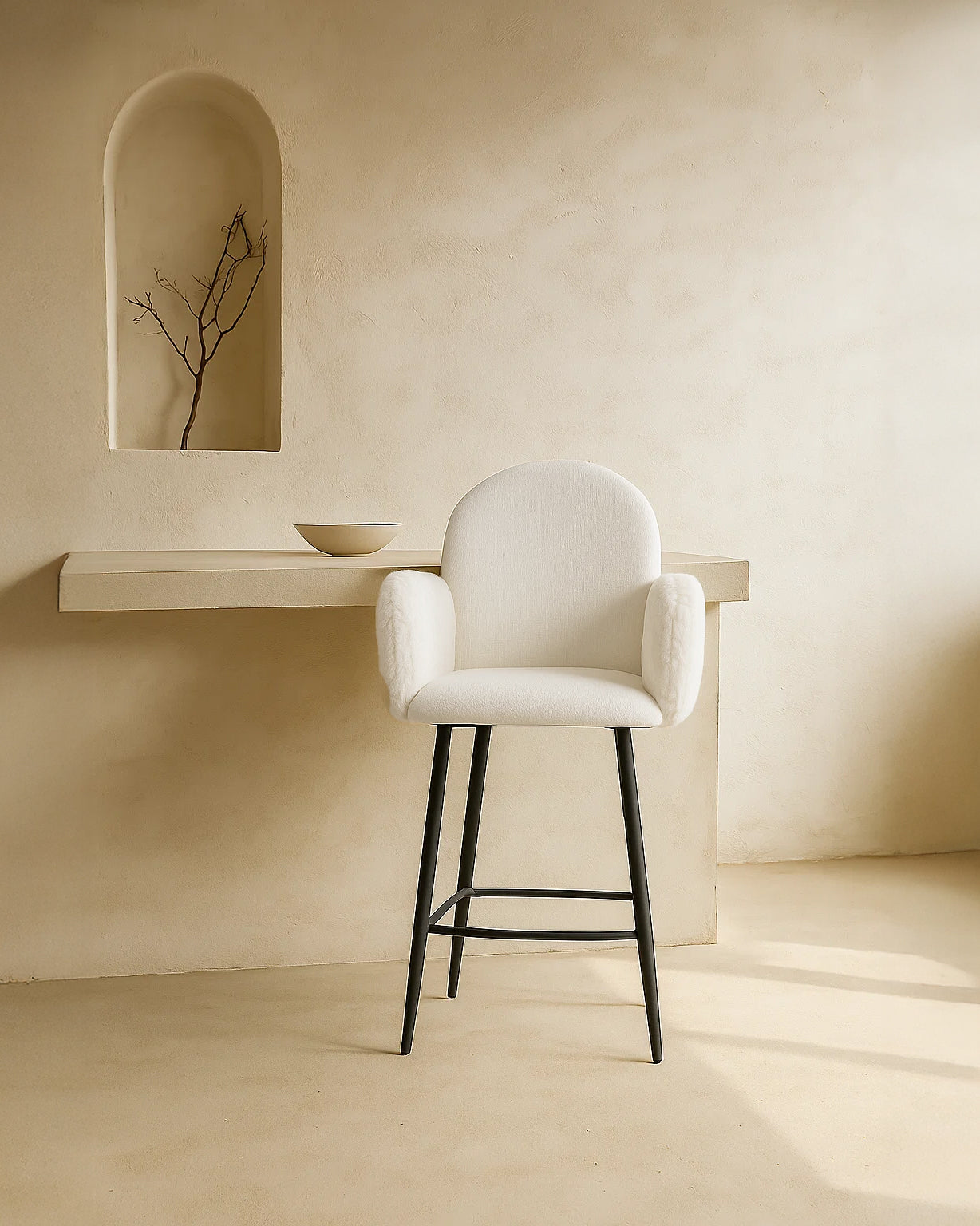 Votre îlot de cuisine vient de gagner en style. Le tabouret de bar Nubbi reprend tout ce que nous aimons dans la chaise de salle à manger — des accoudoirs roulés sculpturaux, une texture cosy, une forme audacieuse — et le soulève, littéralement.