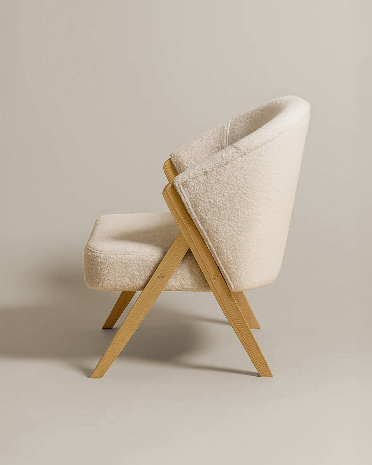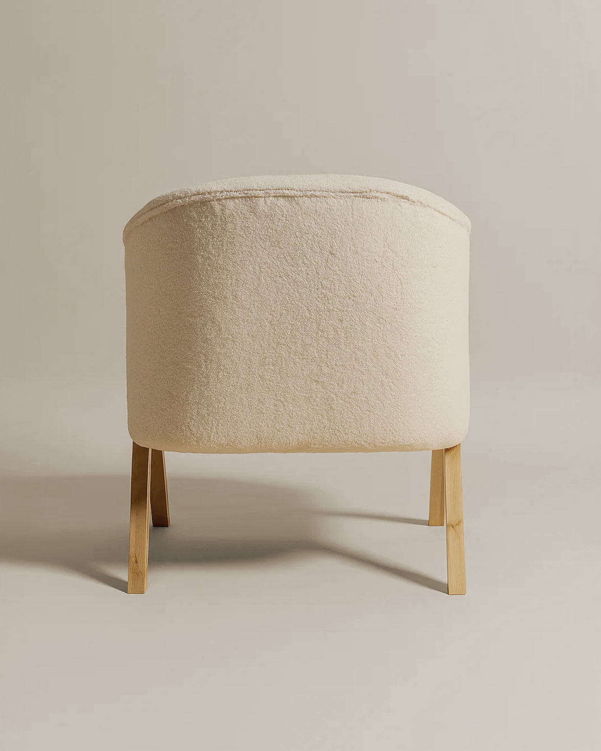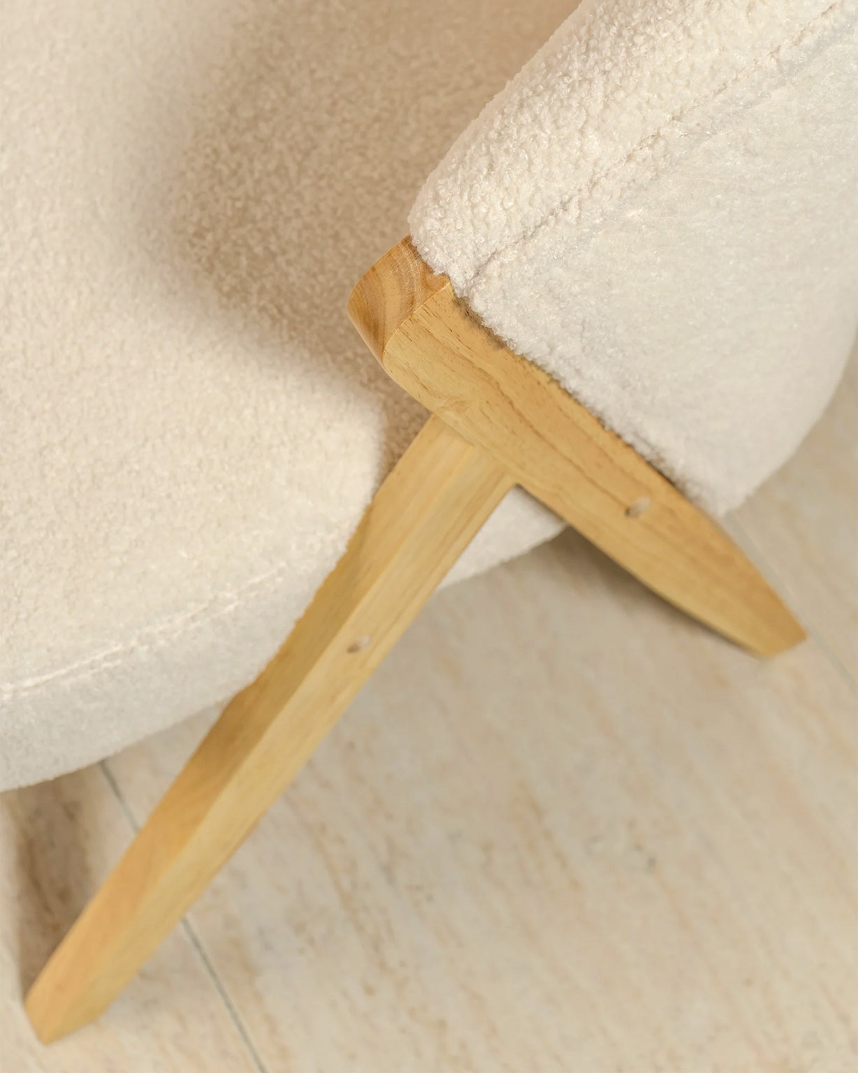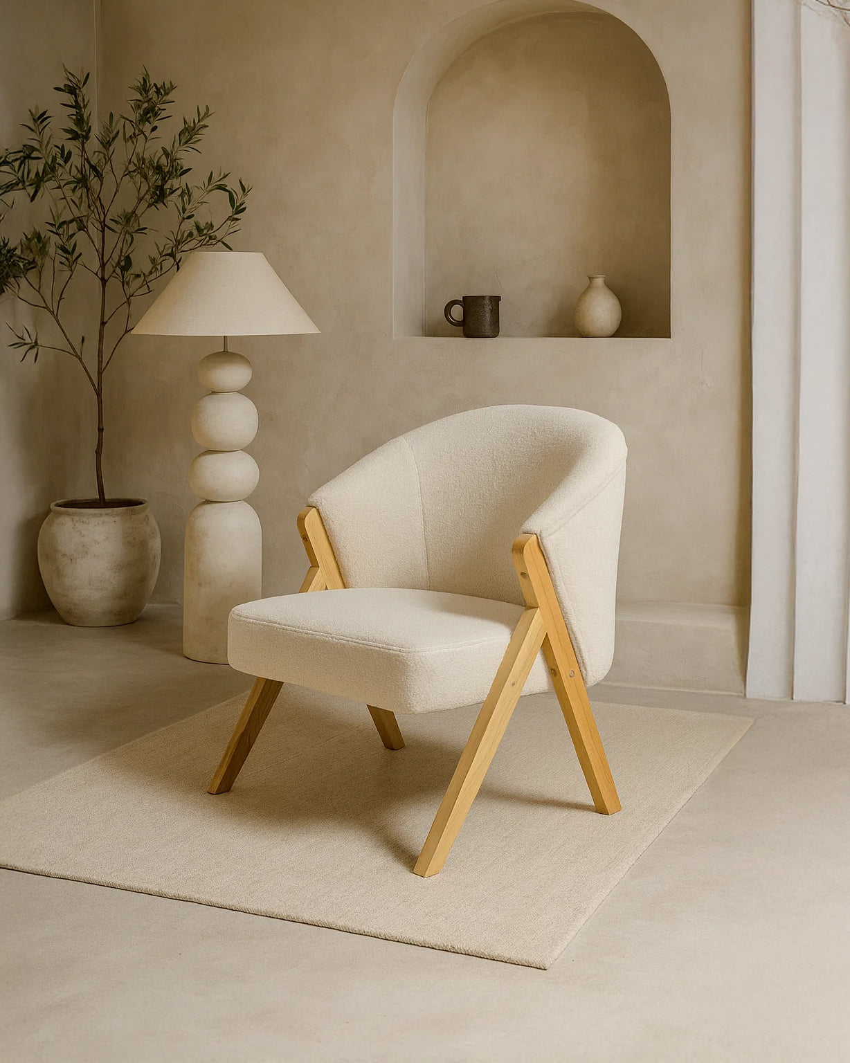 De houten poten en gevoerde zitting houden het gezellig, terwijl de neutrale tinten en tijdloze silhouet betekenen dat het in bijna elke ruimte werkt—of dat nu een moderne lounge, een gezellige leeshoek of een dromerige slaapkamerhoek is.