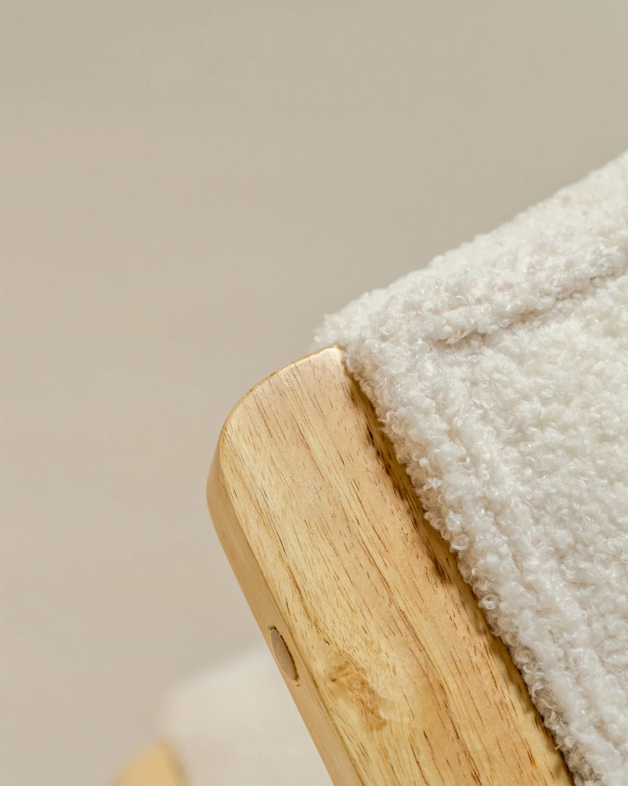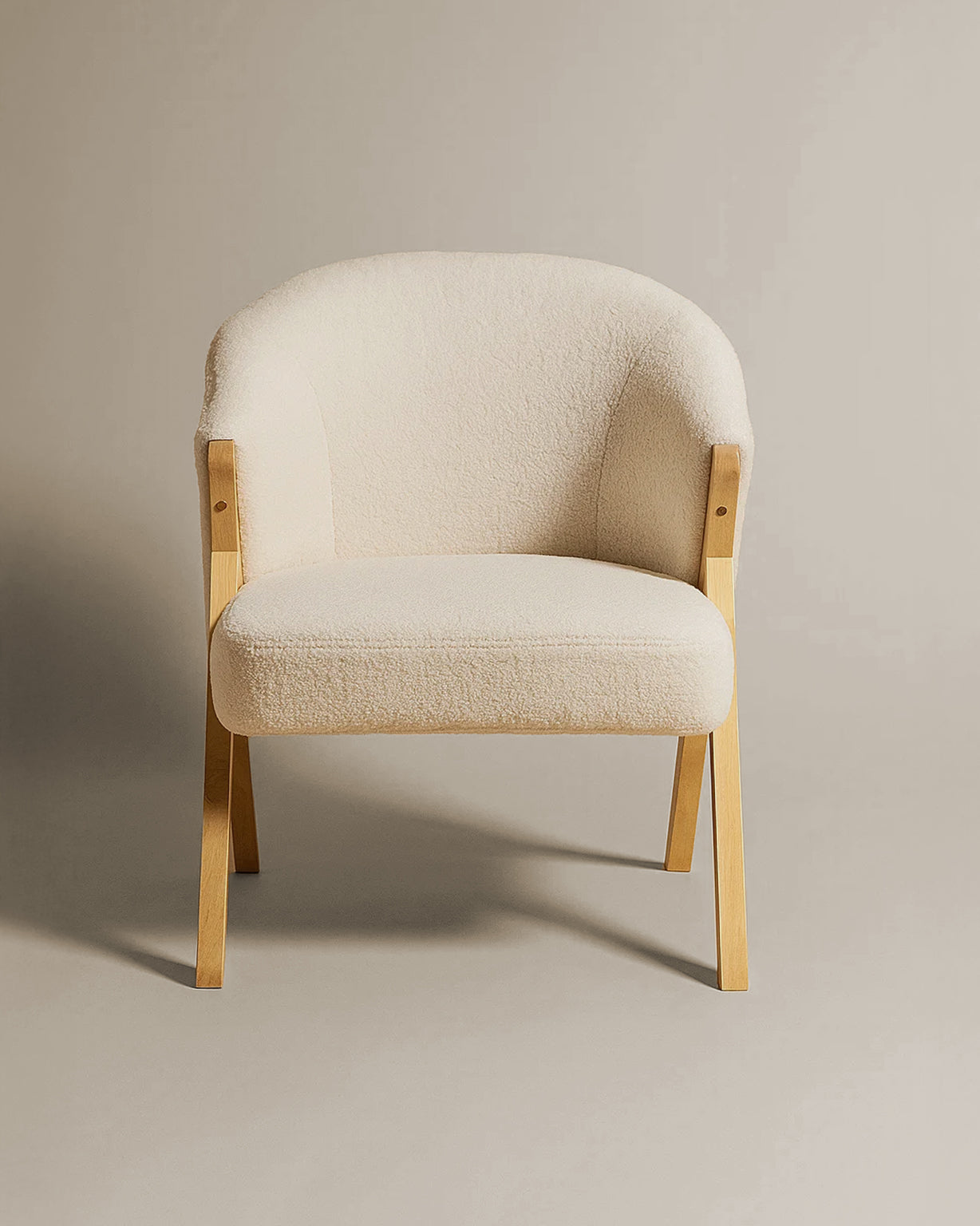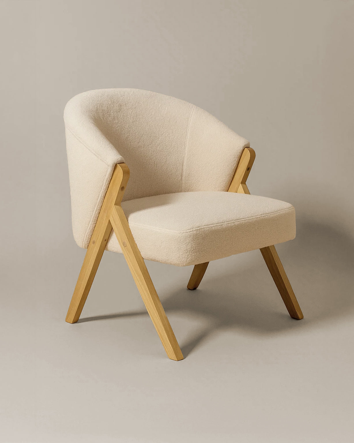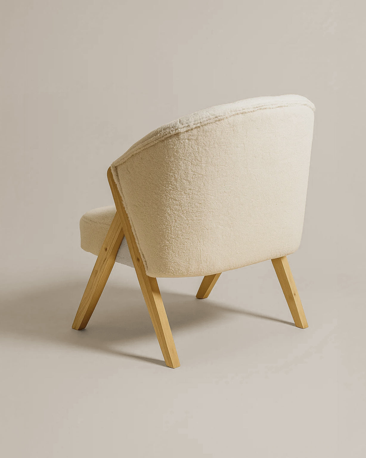 De houten poten en gevoerde zitting houden het gezellig, terwijl de neutrale tinten en tijdloze silhouet betekenen dat het in bijna elke ruimte werkt—of dat nu een moderne lounge, een gezellige leeshoek of een dromerige slaapkamerhoek is.
