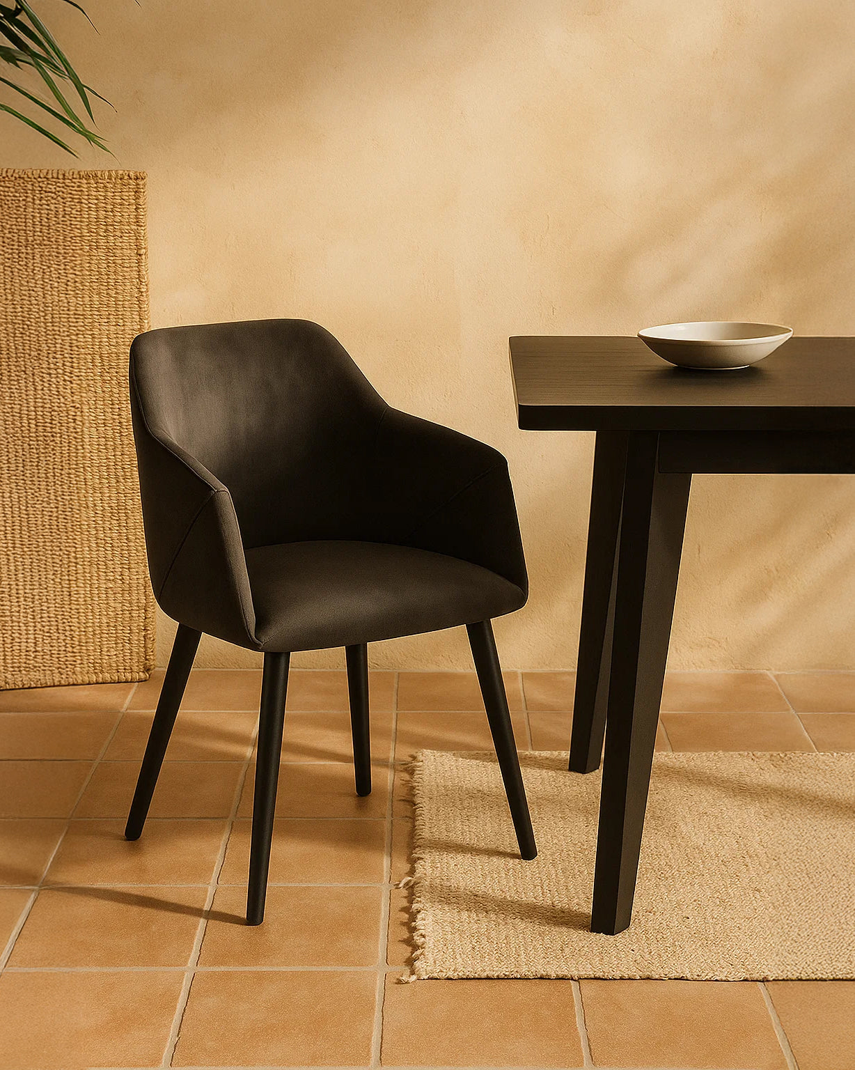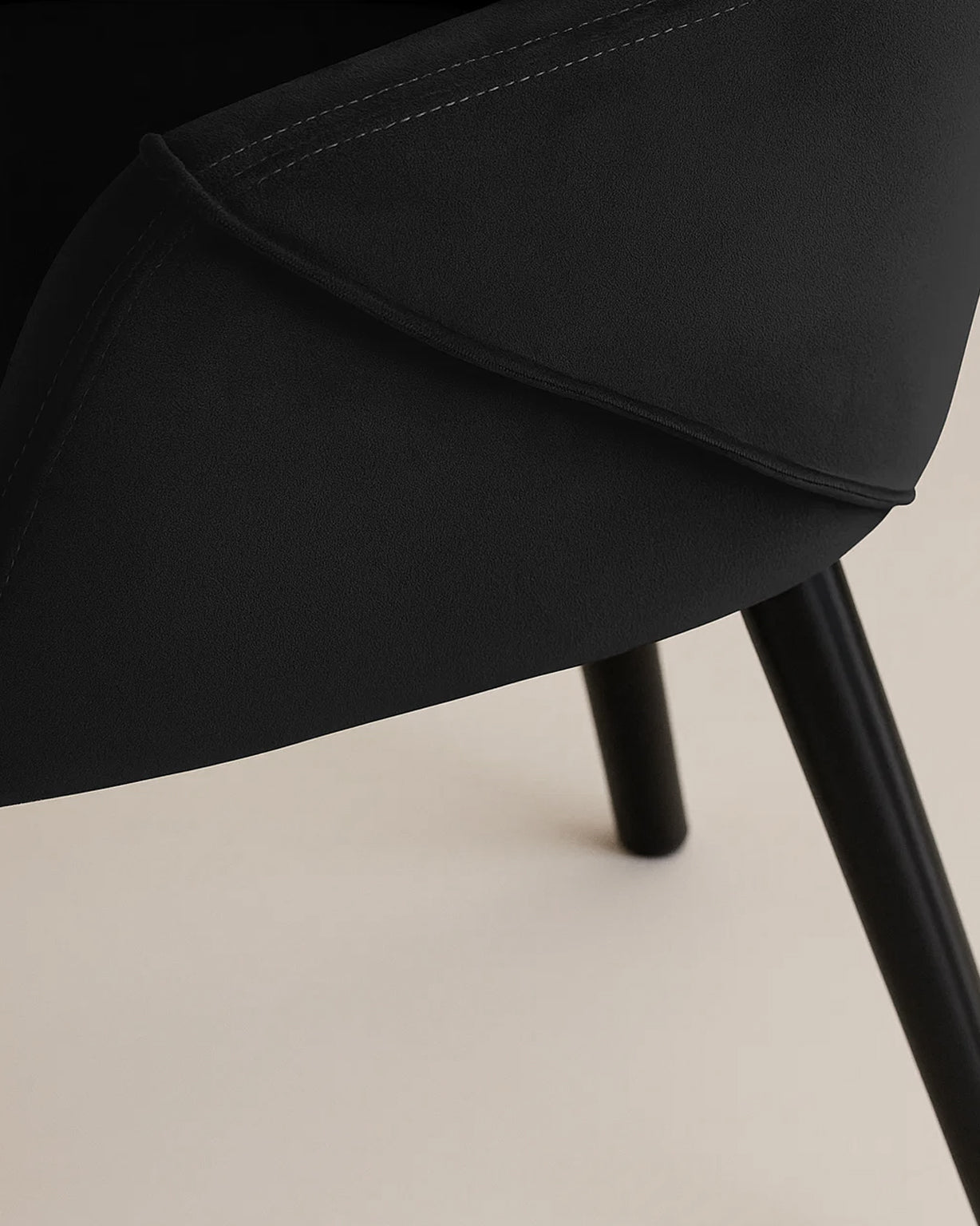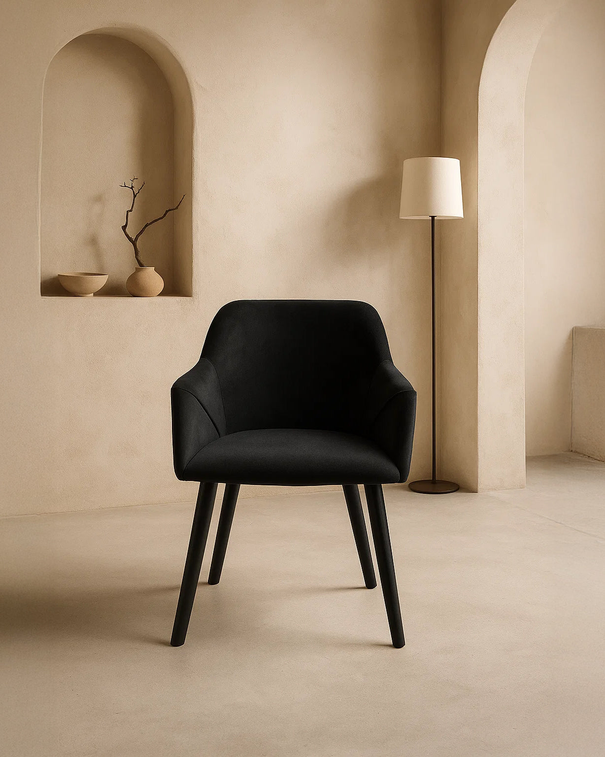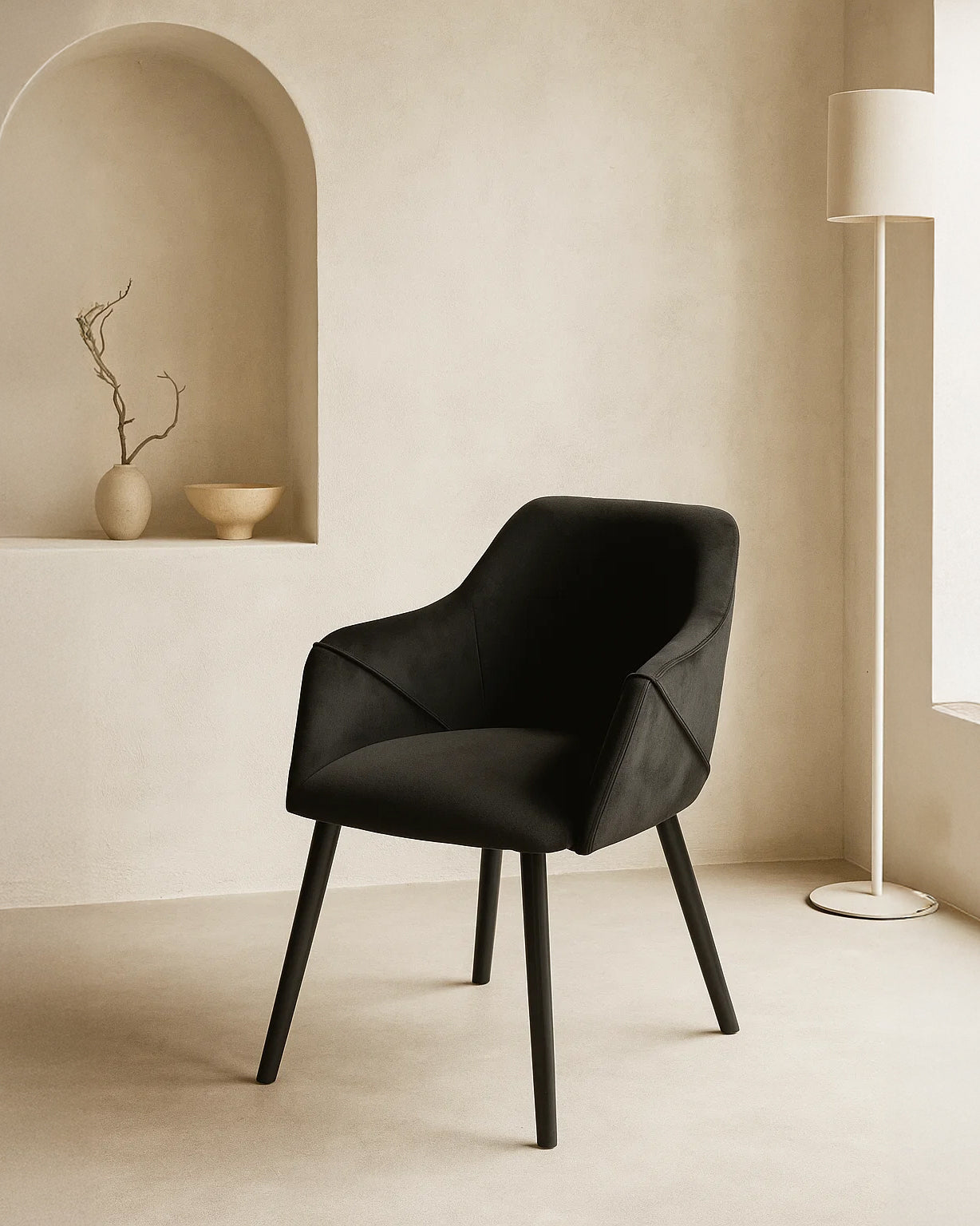 Zeg hallo tegen Bonanova — onze fluwelen eetkamerstoel die net zo goed aanvoelt als hij eruitziet. Ontworpen met zacht gebogen armen, een comfortabel gewatteerde zitting en slanke zwarte poten, is het het soort stoel dat elk eetmoment verbetert, van doordeweekse afhaalmaaltijden tot wijnrijke diners.