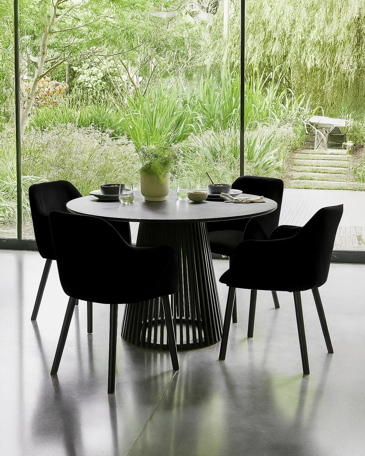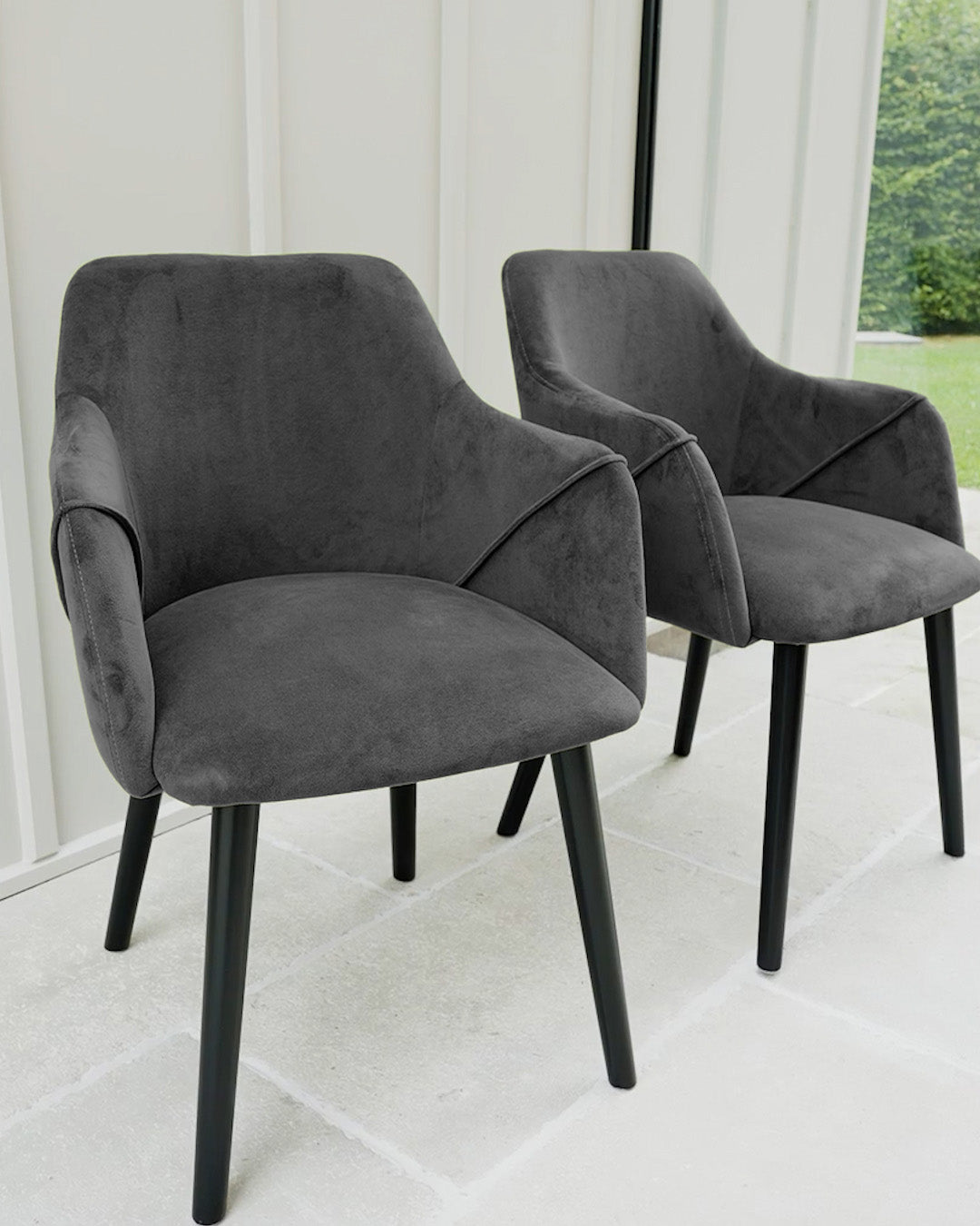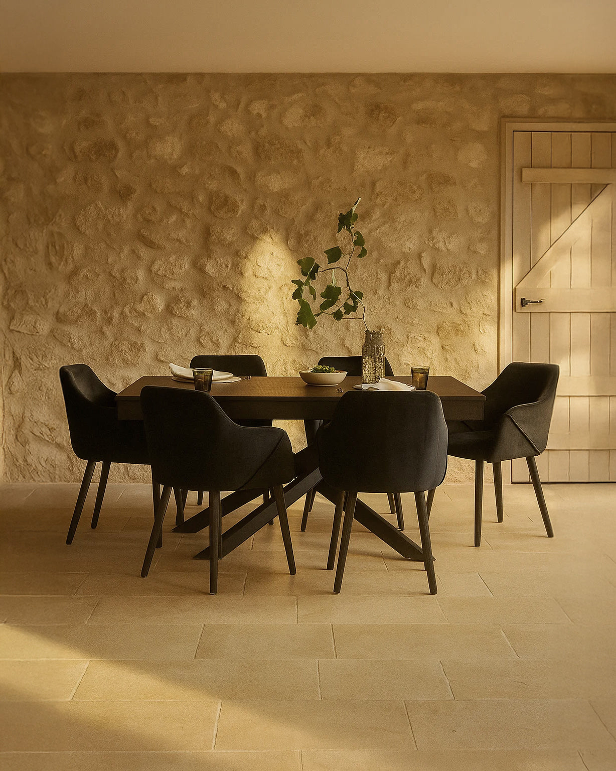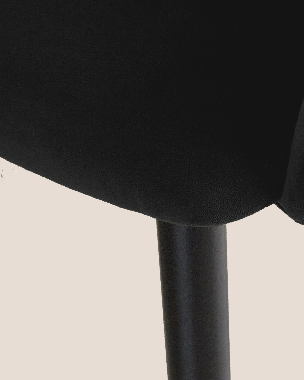 Zeg hallo tegen Bonanova — onze fluwelen eetkamerstoel die net zo goed aanvoelt als hij eruitziet. Ontworpen met zacht gebogen armen, een comfortabel gewatteerde zitting en slanke zwarte poten, is het het soort stoel dat elk eetmoment verbetert, van doordeweekse afhaalmaaltijden tot wijnrijke diners.